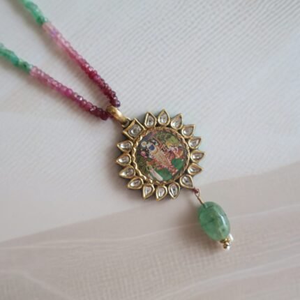 22kt gold Shreenath Ji pendant with diamond polkies, sapphires, emeralds, and ruby string layers – handcrafted traditional Indian temple jewelry.