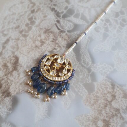 Handcrafted in 22kt gold, this Maang Tikka shines with emeralds, rubies, diamond polkies, and freshwater pearls — a royal touch for brides and festive wear.