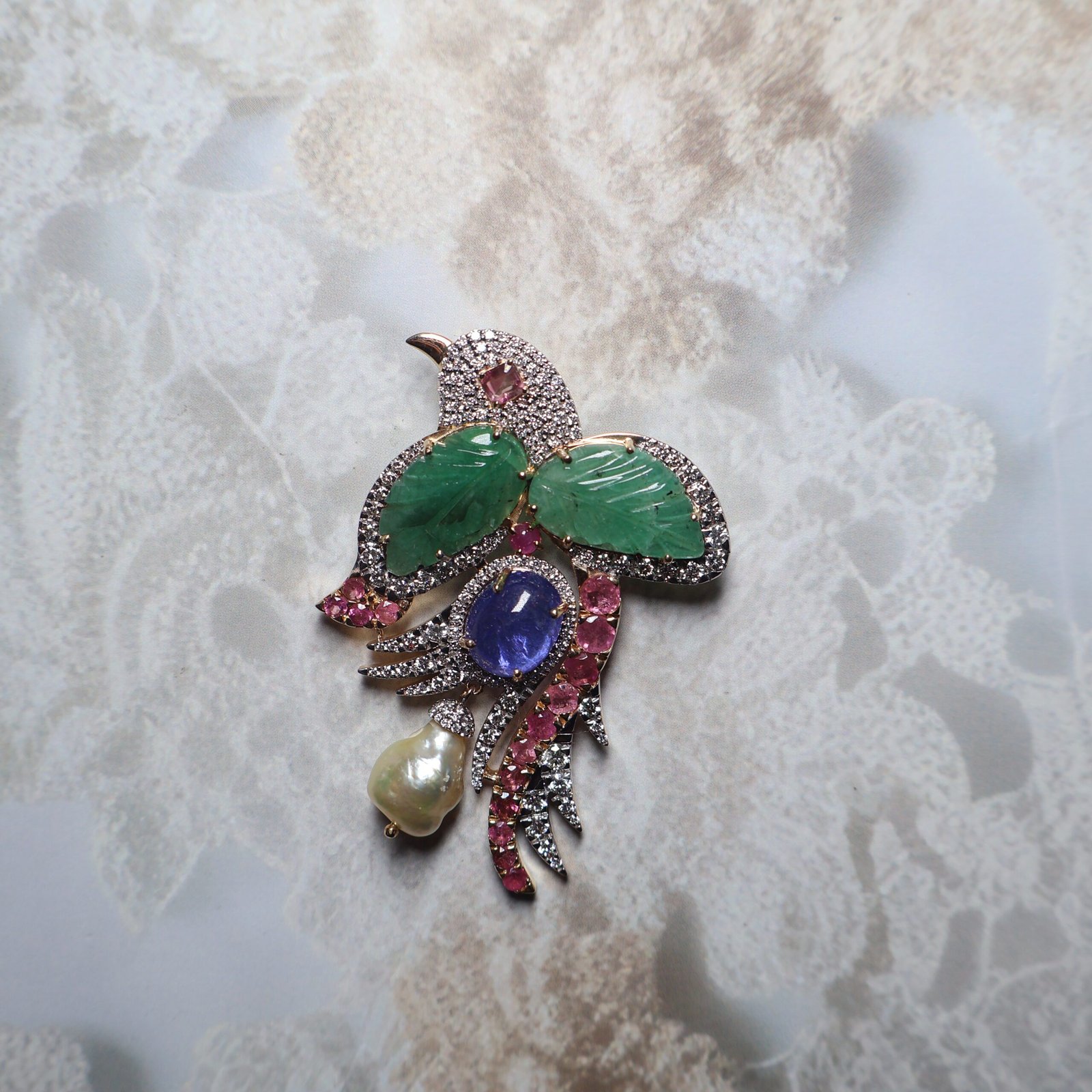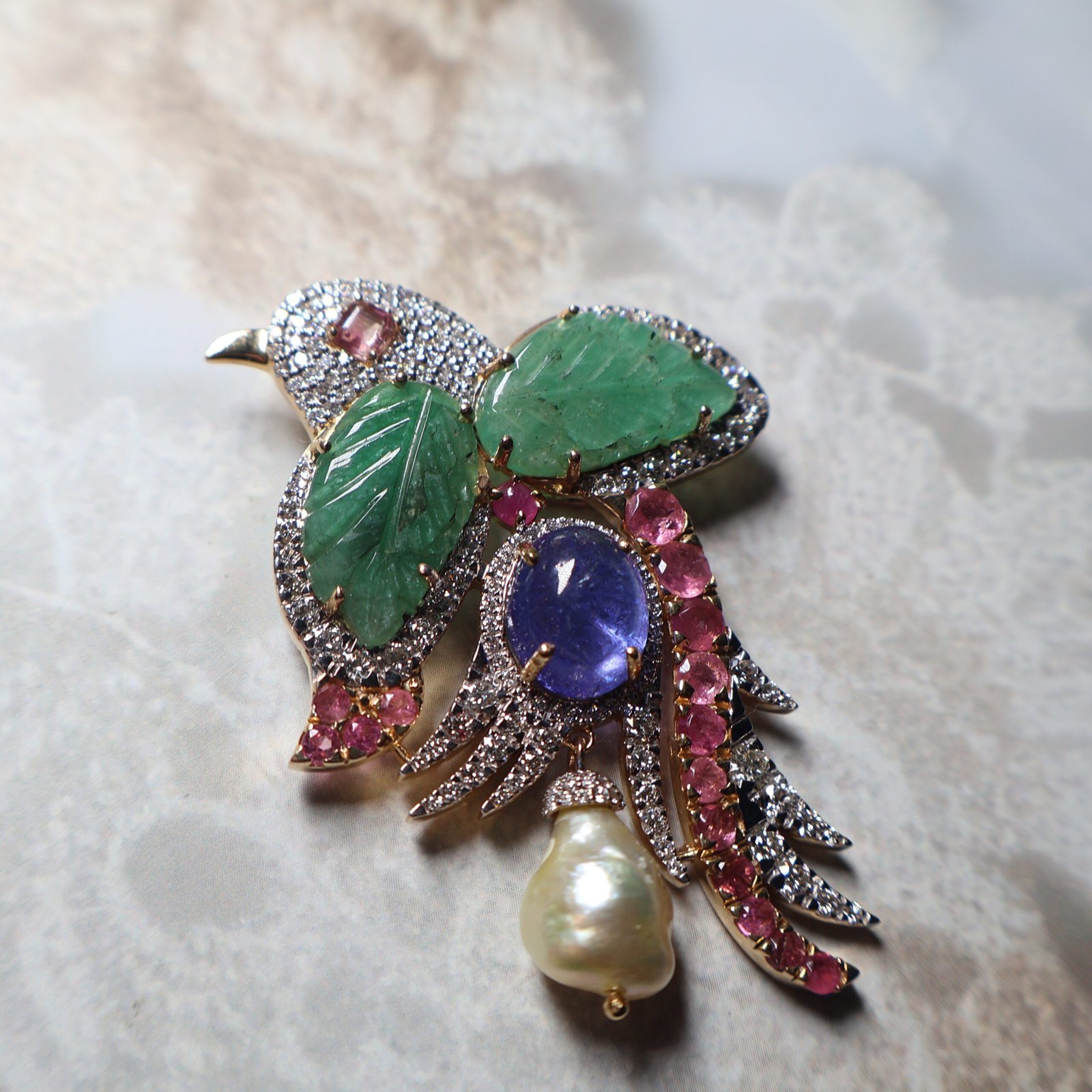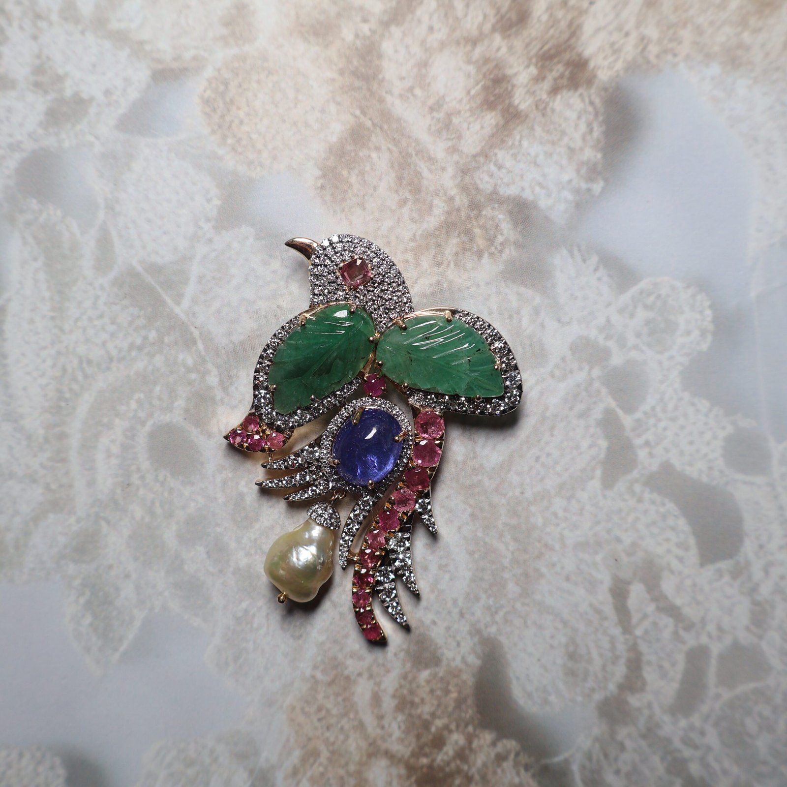 Experience true artistry with this exquisite 14kt gold brooch and pendant, a versatile masterpiece designed to be worn both as a statement pin or an elegant neckpiece. Handcrafted by skilled artisans, this piece features a rare and captivating blend of premium gemstones — rich emeralds, sparkling diamonds, vivid tanzanite, deep rubies, vibrant rubellites, and lustrous keshi pearls.