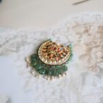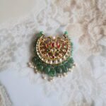 A regal Chandrama (moon-shaped safa brooch) handcrafted in 22kt gold plating, designed especially for grooms and men of honor. This traditional piece is intricately studded with polished Kundan stones that reflect timeless elegance, paired with rich emerald drops and accents to enhance its royal appeal. The crescent shape symbolizes beauty and pride, making it a classic accessory for weddings and grand celebrations. Designed to be worn on a safa or turban, the back features a sturdy pin for secure placement. Every element is finely detailed by artisans to complement ethnic menswear with grandeur and class.