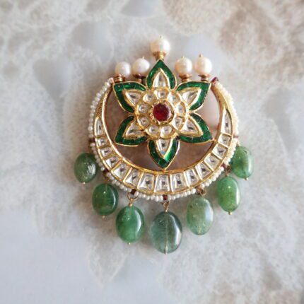 This beautiful Chandrama is crafted in pure 22 KT gold and decorated with traditional diamond polkies and classic Kundan stones. The natural shine of diamond polkies gives a royal and antique look, while the Kundan work adds rich traditional beauty. Its detailed design makes it perfect for brides and festive occasions. This piece adds grace, elegance, and a complete traditional touch to your outfit.