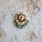 This beautiful Chandrama is crafted in pure 22 KT gold and designed with traditional Kundan work, green emeralds, and delicate freshwater pearls. The rich gold base gives it a royal look, while the Kundan setting adds classic bridal charm. The emeralds bring a touch of vibrant colour, and the freshwater pearls add softness and grace. Perfect for weddings, bridal wear, and festive occasions, this Chandrama completes your traditional look beautifully.