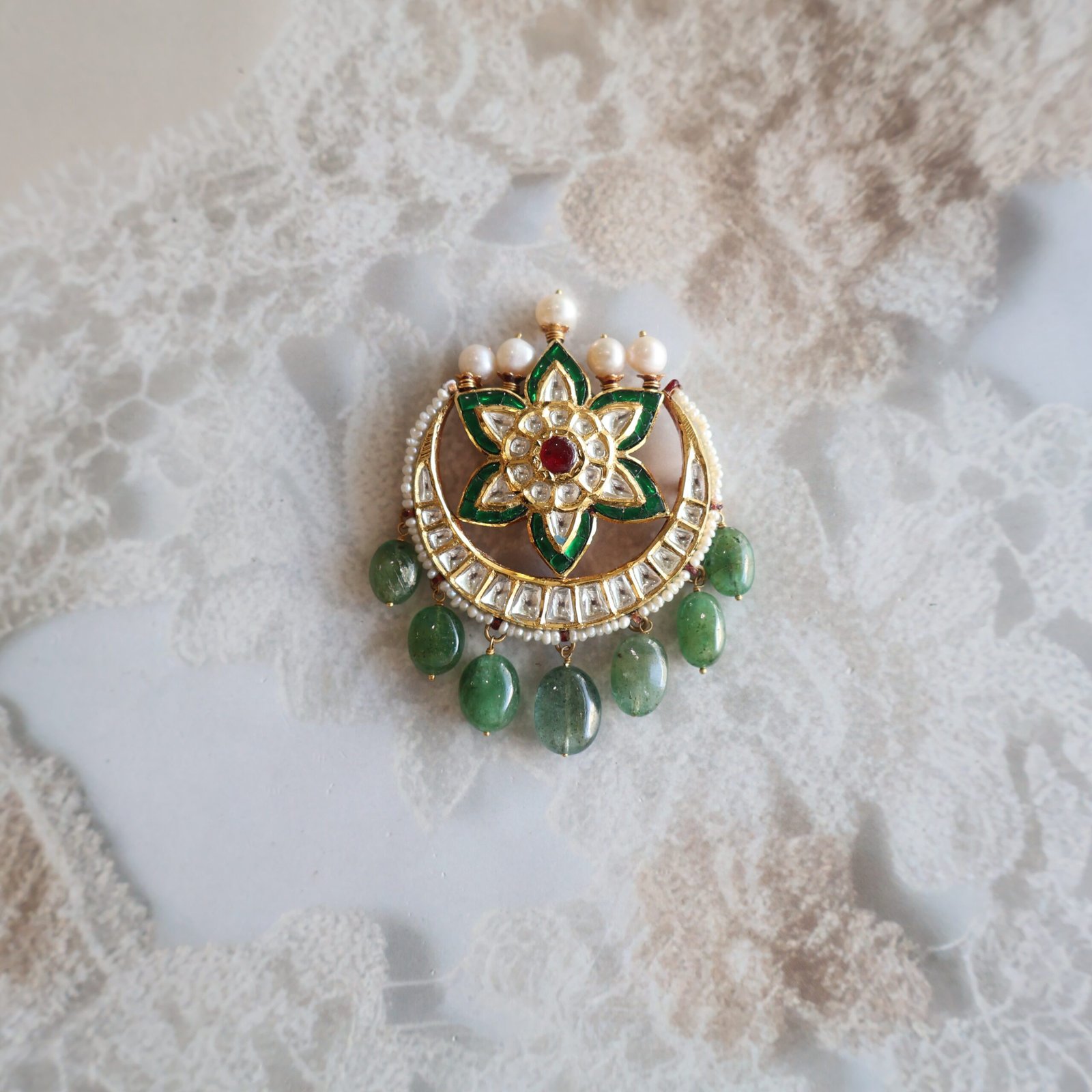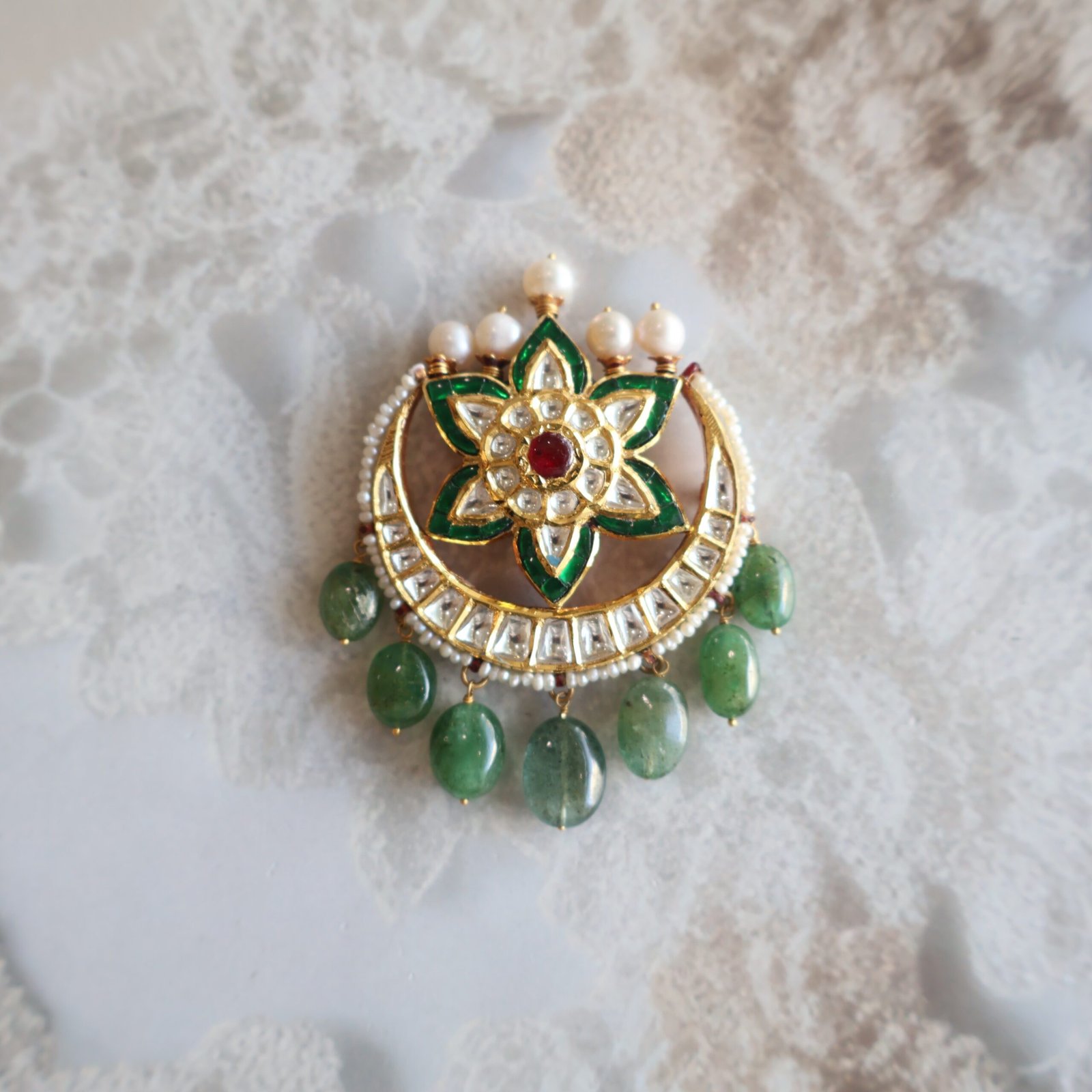 22 KT gold Chandrama with Kundan, emeralds, and freshwater pearls for a royal and traditional look.