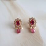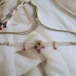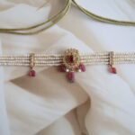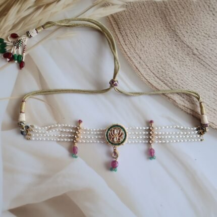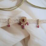 A majestic choker set handcrafted in 22kt hallmarked gold, intricately adorned with a rich combination of traditional Jadau stones, sparkling American diamonds, and vibrant rubies and emeralds. The detailed design features floral and paisley motifs, highlighted with freshwater pearls that delicately fringe the base, adding a graceful drape. The choker is structured for a snug yet comfortable fit and comes with matching earrings that mirror the main piece’s design. This handcrafted set reflects regal craftsmanship and is perfect for weddings, receptions, or festive occasions.