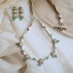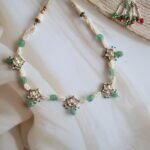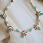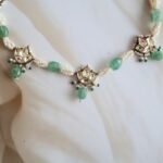A beautifully handcrafted choker set in 22kt hallmarked gold, intricately adorned with high-polish Kundan stones arranged in traditional floral motifs. The design is elegantly bordered with lustrous freshwater pearls, creating a soft, graceful finish around the neckline. The choker sits comfortably with an adjustable dori at the back, ensuring a perfect fit. It comes with matching earrings that reflect the same regal craftsmanship. Ideal for weddings, cultural functions, and festive occasions, this set is a timeless representation of Indian heritage jewellry.