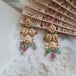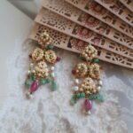 Step into royal elegance with these handcrafted 22kt gold Jadau earrings, a masterpiece of heritage jewellery. Set with the deep green allure of emeralds and the soft, glowing charm of freshwater pearls, these earrings embody a balance of luxury and tradition. The intricate Jadau craftsmanship reflects centuries of artistry, making them the perfect choice for bridal wear, festive celebrations, or heirloom collections. Their timeless appeal ensures they remain a treasure for generations, adding sophistication and grace to any attire.
