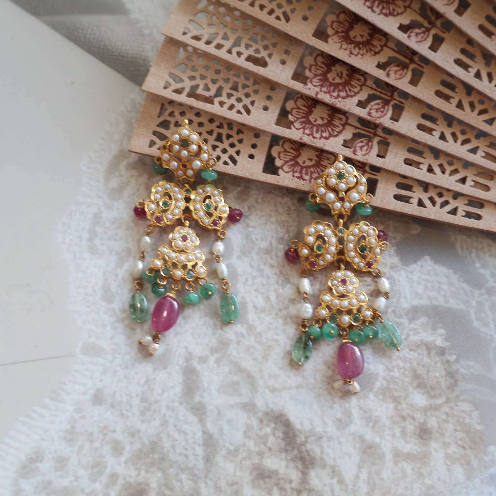 Exquisite 22kt gold Jadau earrings adorned with rich emeralds and lustrous freshwater pearls.