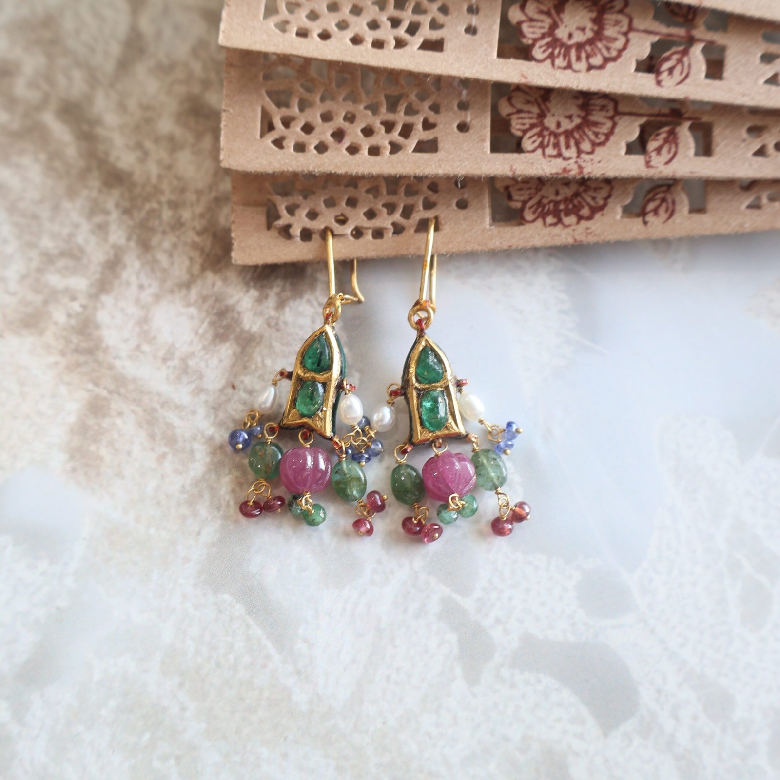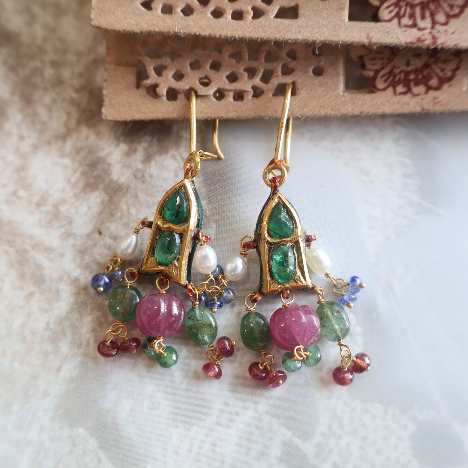 Handcrafted 22kt gold fish-motif earrings embellished with emeralds, rubies, and freshwater pearls — a blend of culture, colour, and luxury. Perfect for festive and bridal elegance.