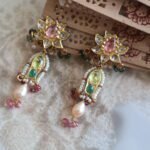 Handcrafted 22kt gold earrings featuring diamond polkies, multicolour tourmalines, and freshwater pearls — a luxurious blend of colour, sparkle, and traditional elegance.