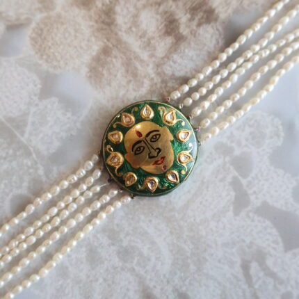 Enhance your bridal elegance with this exquisite 22kt gold Mehri, meticulously handcrafted to reflect timeless tradition and luxury. The design features radiant kundan stones that add a royal brilliance, beautifully complemented by soft, natural freshwater pearls for a graceful finish.