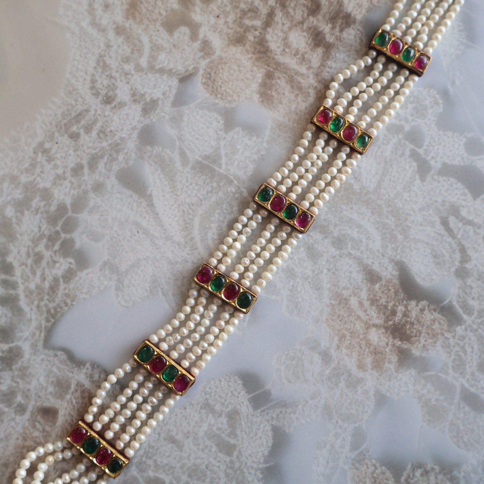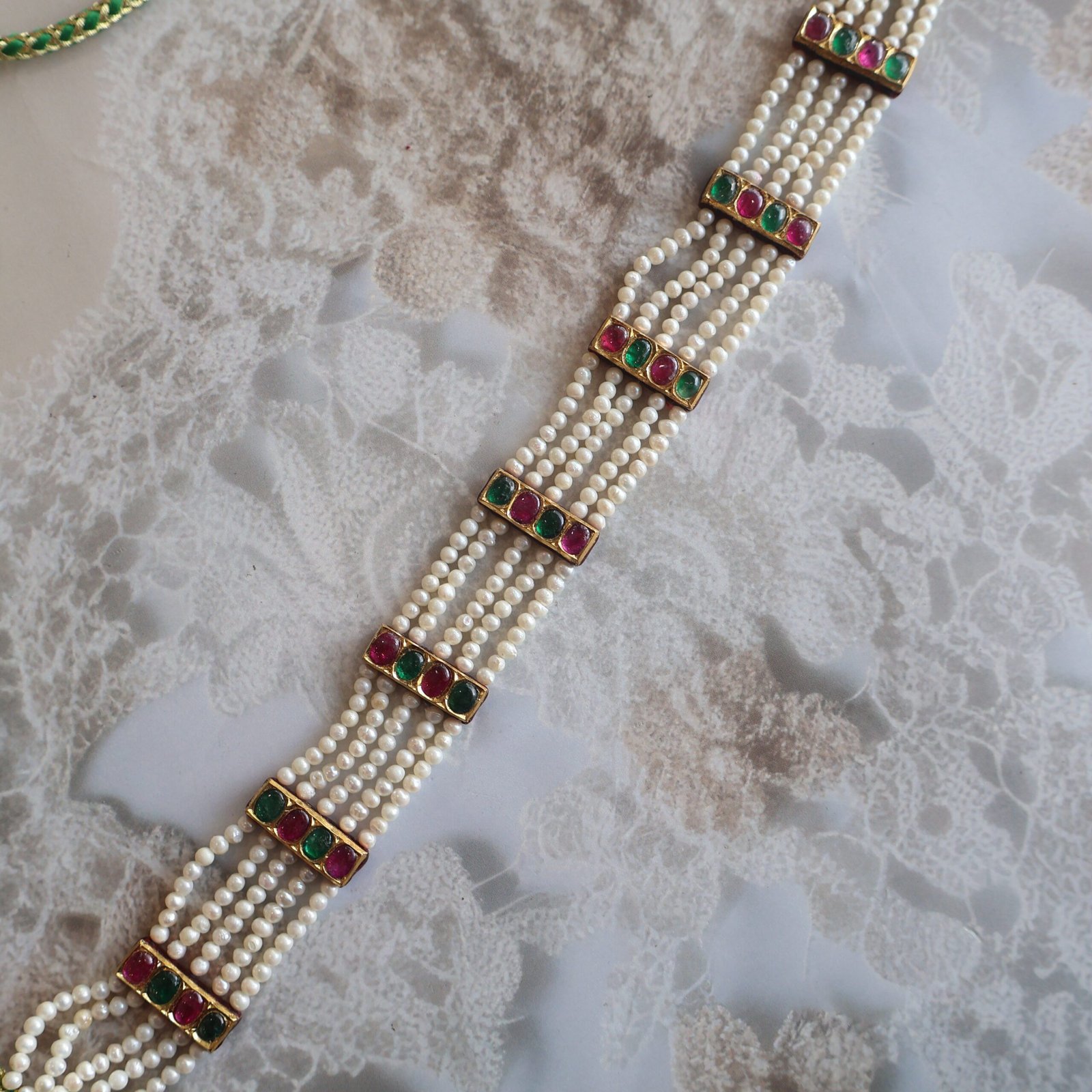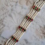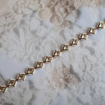 Enhance your bridal look with this exquisite 22kt gold mehr, a timeless accessory crafted with precision and heritage artistry. The piece features beautifully set kundan stones that radiate royal brilliance, perfectly complemented by soft, natural freshwater pearls that add graceful charm.