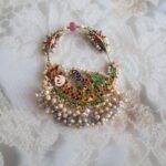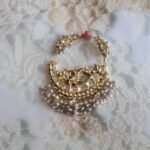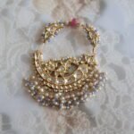 Step into timeless elegance with this luxurious 22kt gold Nath, meticulously handcrafted to perfection. Adorned with shimmering diamond polkies, rare and lustrous Basra pearls, and regal kundan stones, this Nath reflects the finest traditions of Indian bridal jewellery.