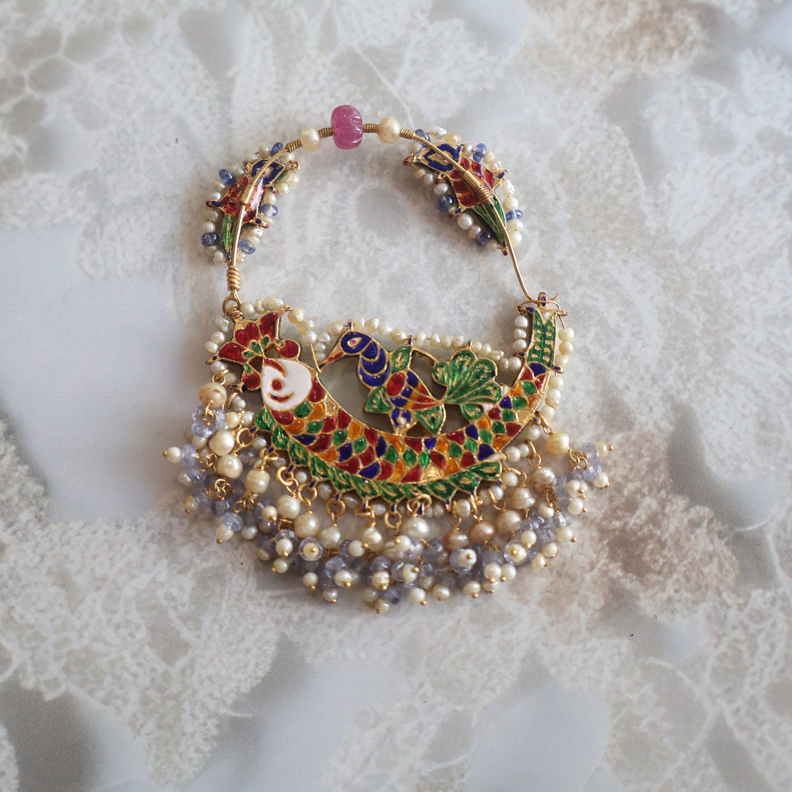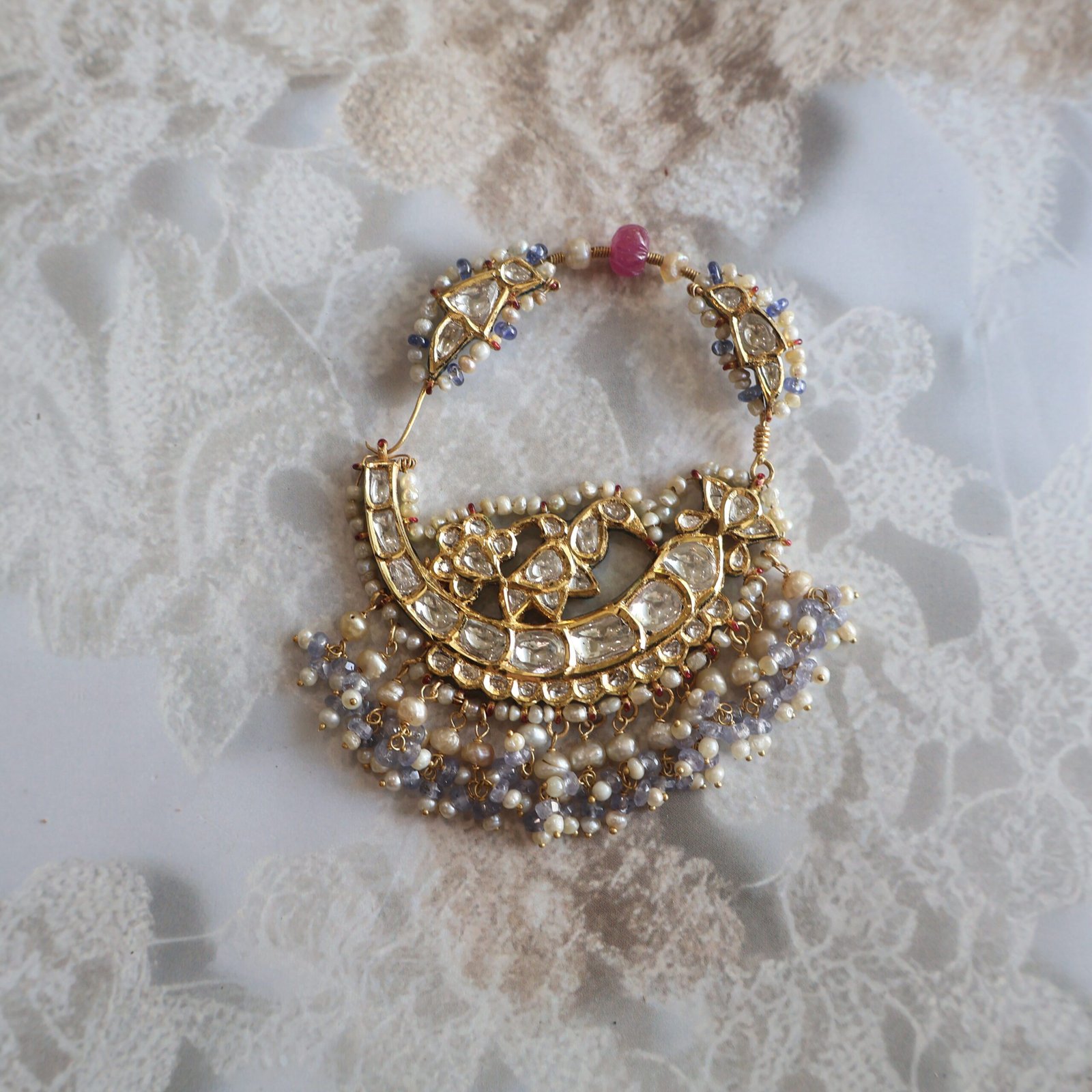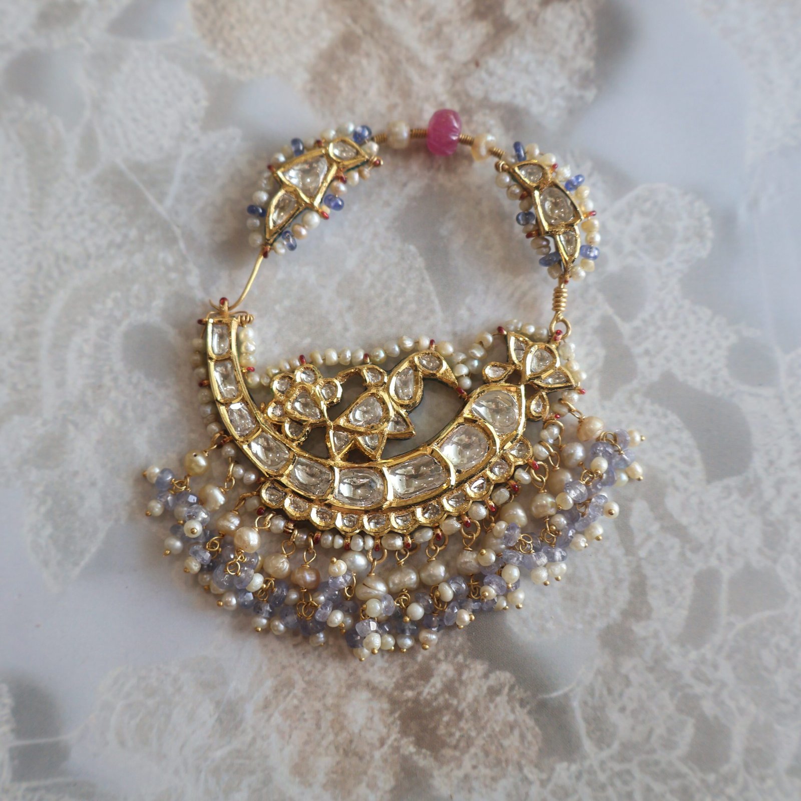 Exquisite 22kt gold Nath embellished with diamond polkies, Basra pearls, kundan stones, rubies, tanzanites, iolites, and detailed backside enamelling—a true bridal masterpiece.