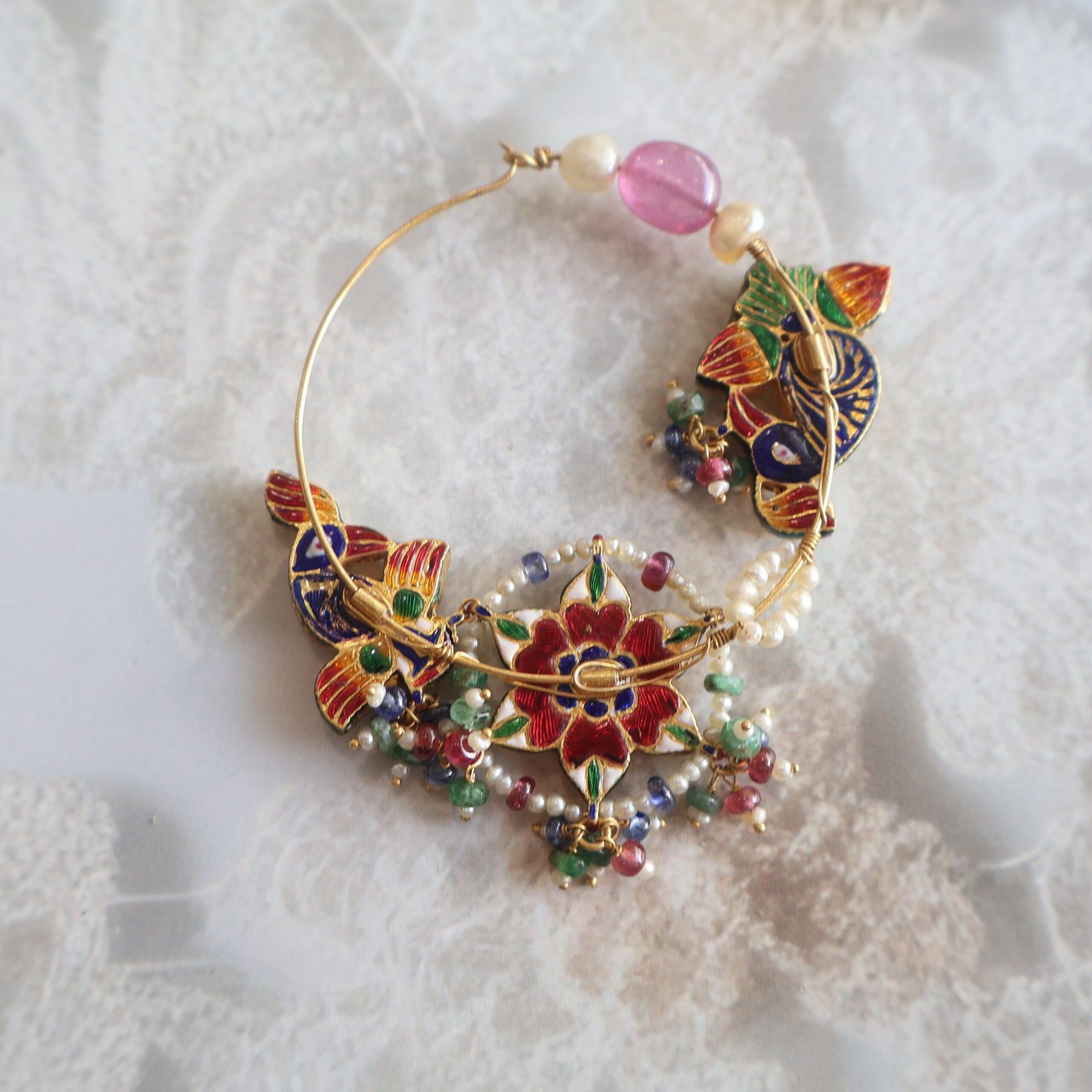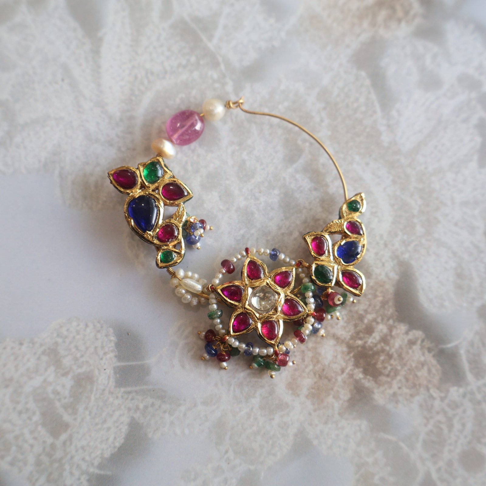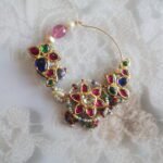 Handcrafted 22kt gold Nath adorned with diamond polkies, Basra pearls, rubies, blue sapphires, and emeralds, finished with intricate backside enamelling—a perfect masterpiece for bridal elegance.