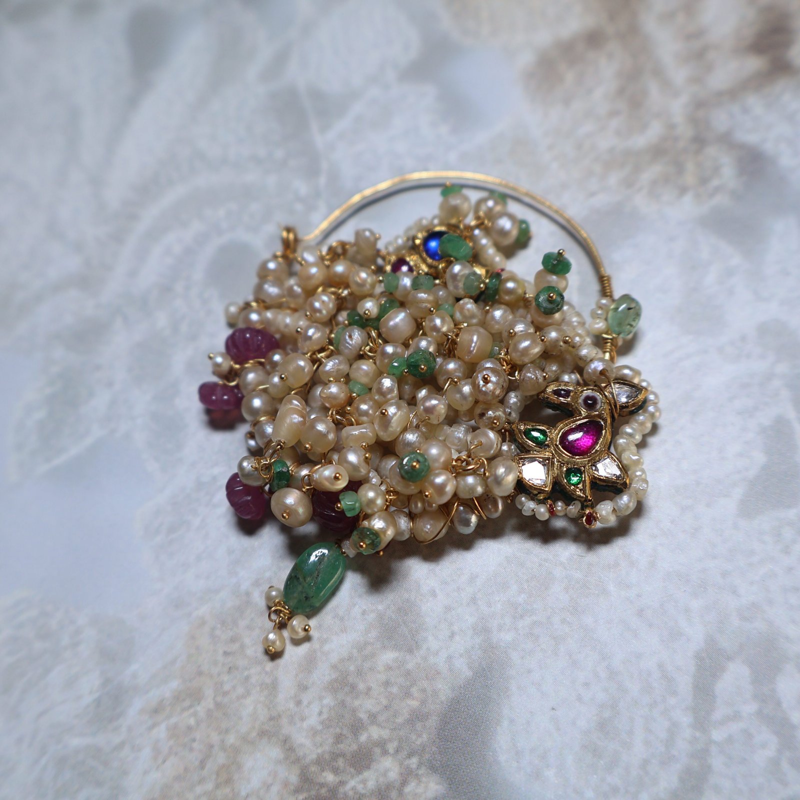 Luxurious 22kt gold Nath studded with Basra pearls, rubies, emeralds, diamond polkies, and blue sapphire, crafted for a regal bridal look.
