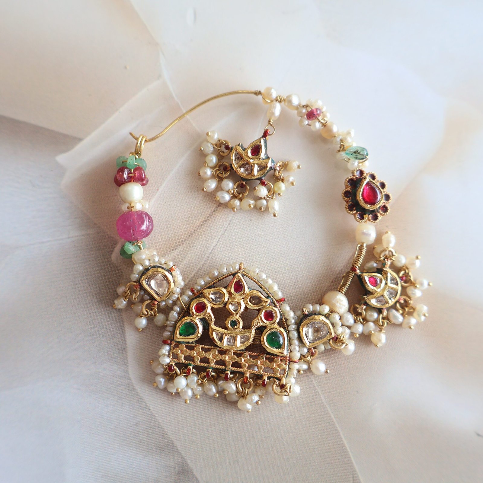 This magnificent 22kt gold Nath is a true expression of royal Indian craftsmanship. Handcrafted in pure gold, it is beautifully studded with luminous Basra pearls, vibrant emeralds, rich rubies, and sparkling diamond polkies, creating a harmonious blend of colour and brilliance.