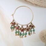 This exquisite Nath showcases five intricately designed fish motifs, each crafted in luxurious 22-karat gold. Each fish is a symbol of prosperity and grace, studded with radiant diamond polkies, vibrant rubies, and lustrous freshwater pearls that add depth and elegance to the piece. Ideal for traditional events or weddings, this Nath harmonizes beautifully with ethnic attire, adding a touch of uniqueness and cultural richness to your look. Each fish motif is finely detailed to create a cohesive design, celebrating both beauty and artistry. As gold prices change daily, please contact us directly for the most up-to-date pricing based on the current gold rate. We look forward to helping you celebrate life’s special moments with a timeless piece.