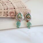 Elevate your jewelry collection with this exquisite pendant set with matching earrings, handcrafted in 22kt gold. The set showcases a stunning fusion of rose-cut diamond polkies, accented with multi-colored sapphire, emerald, and ruby strings that drape gracefully. Intricate meenakari (enamelling) work enhances both the front and back, adding to its timeless charm and elegance. This masterpiece is a perfect blend of regal tradition and modern elegance, making it an ideal choice for weddings, festive occasions, or heirloom gifting.