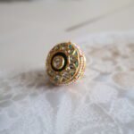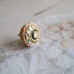 A stunning Rakhri crafted in 22kt gold plating (or solid gold, if applicable), designed with a vibrant combination of firoza (turquoise) stones, shimmering diamond polkies, and delicate freshwater pearls. The central motif features uncut diamond polkies arranged around a bold firoza centerpiece, creating a striking contrast of color and shine. The outer edge is lined with lustrous freshwater pearls, adding grace and softness to the overall design. Finished with a secure gold hook or dori, this Rakhri is lightweight, comfortable to wear, and perfect for weddings, festive occasions, and traditional ceremonies.