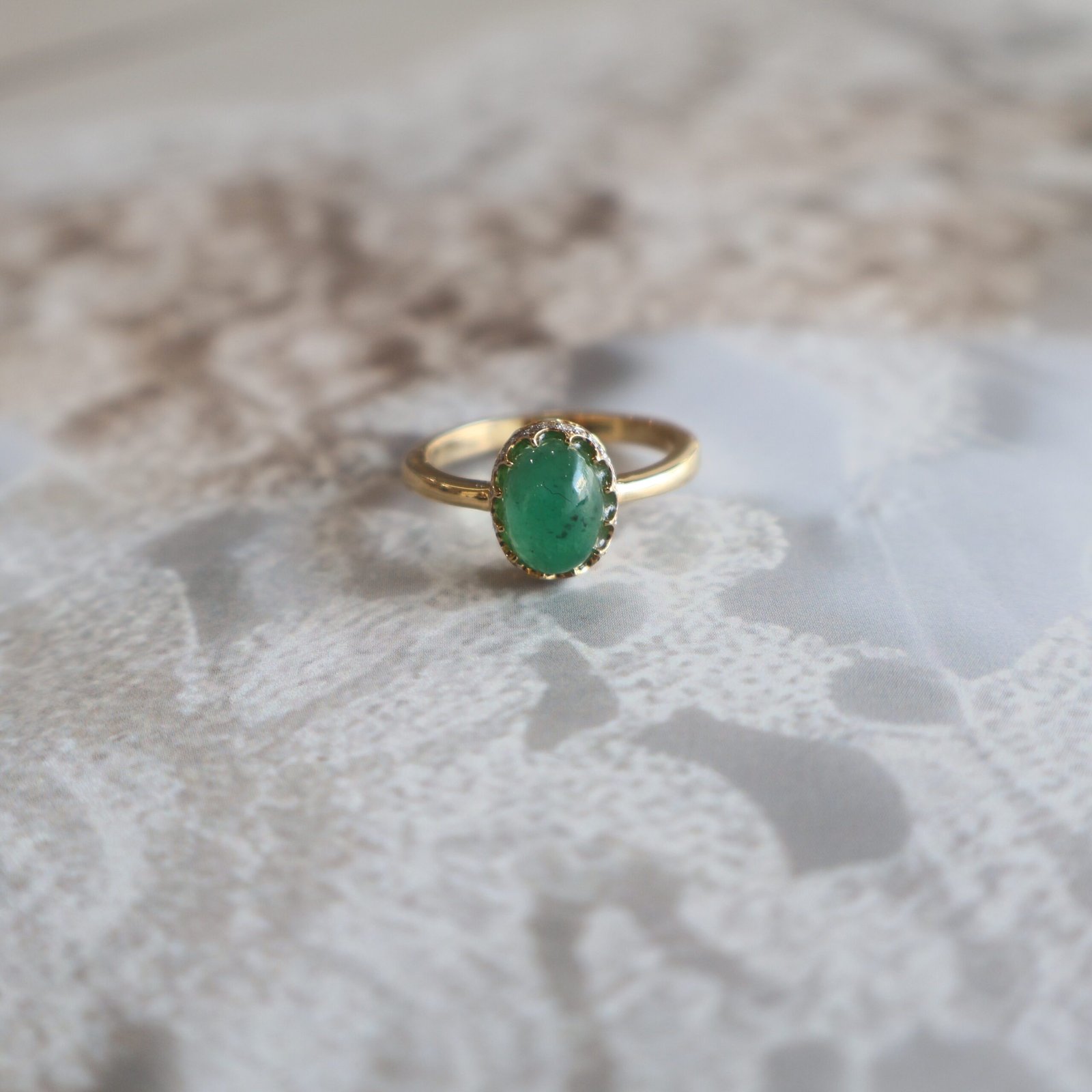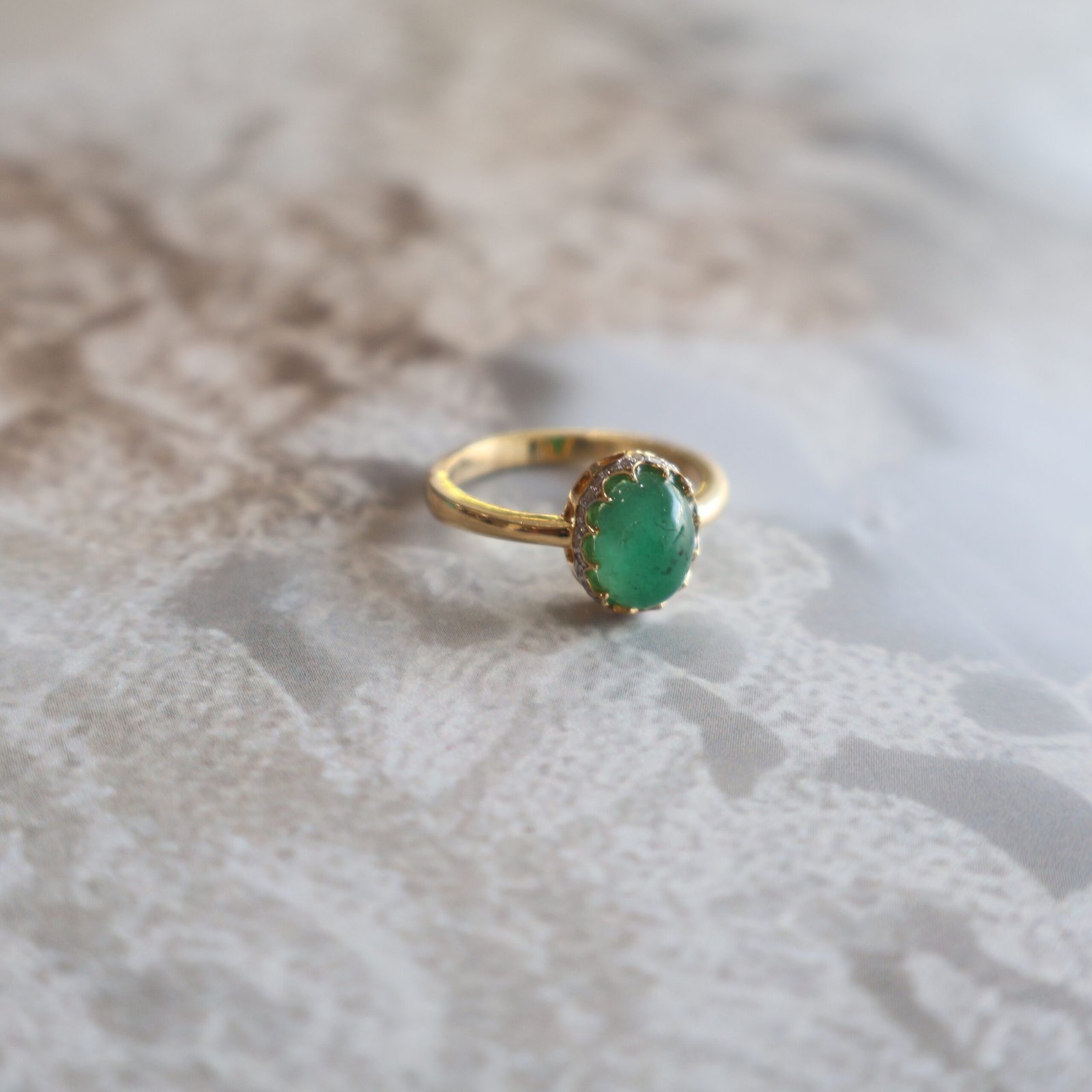 Elegant 18kt gold ring studded with a vibrant emerald and sparkling diamonds, crafted for a timeless and luxurious look.