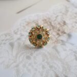 22kt gold ring with carved emeralds and diamond polkies, handcrafted with traditional detailing and vintage finish.