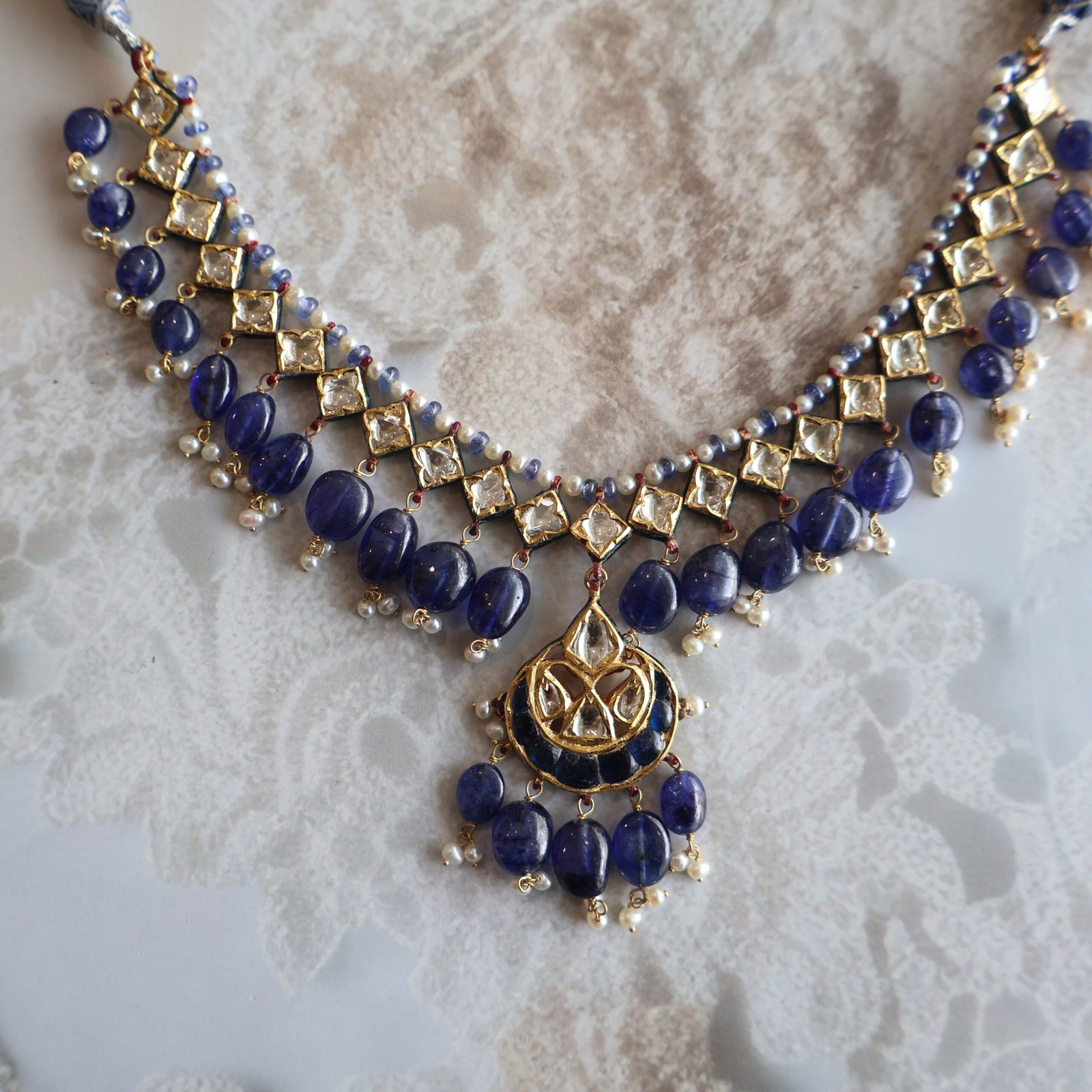 Exquisite 22kt gold necklace set with earrings, studded with blue sapphires, diamond polkies, iolites, and freshwater pearls — a luxurious handcrafted heirloom piece.