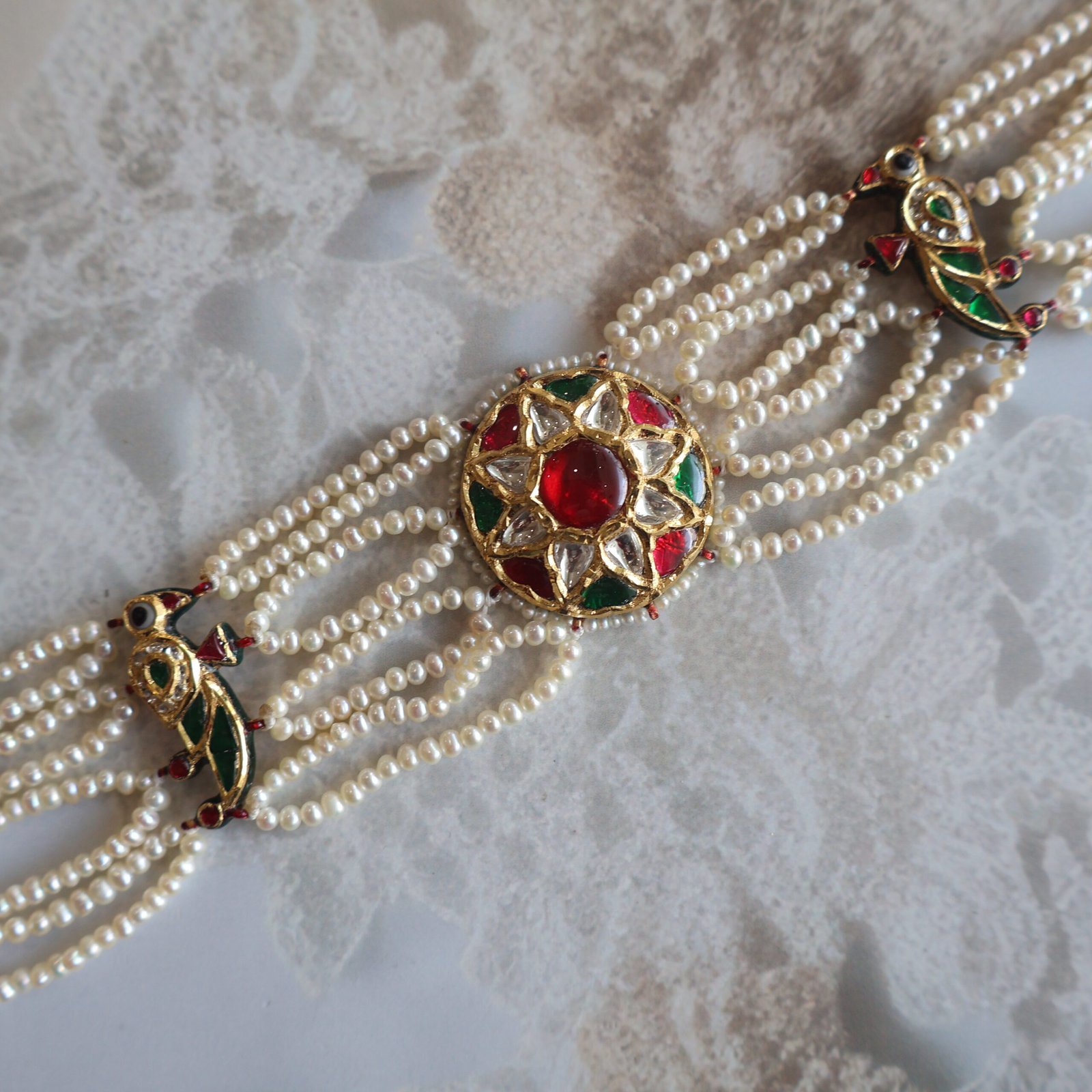 Elevate your bridal look with this exquisite 22kt gold shishfool, a timeless piece crafted to adorn your hair with unmatched grace. Expert artisans hand-set radiant kundan stones, giving it a regal sparkle, while soft freshwater pearls add a touch of delicate sophistication.